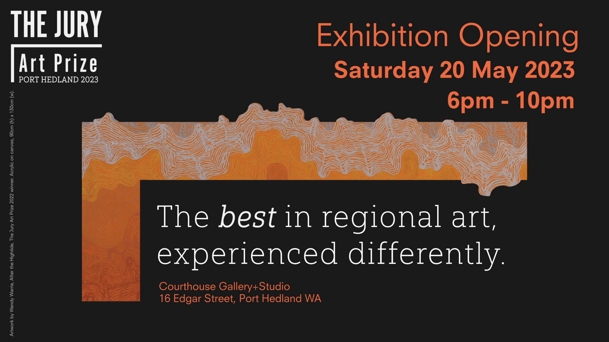 There are four prize categories, The Judges Prize ($10,000), Kathy Donnelly Award ($3,000), and the Patron Award ($3,000 scholarship for a Hedland artist) which will be selected by a panel of judges including Erin Coates, Glenn Iseger-Pilkington, and Anna Louise Richardson. The fourth prize category, the online people’s choice Jury Prize ($10,000), is selected by you, the Jury, and will be announced at the close of the exhibition.