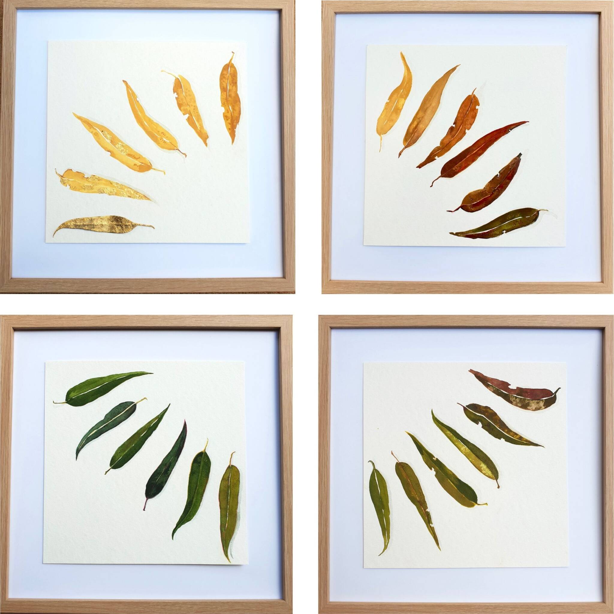 Watercolour, gold leaf and eucalyptus leaf on cotton paper